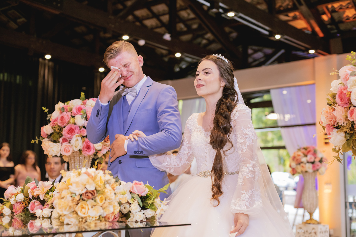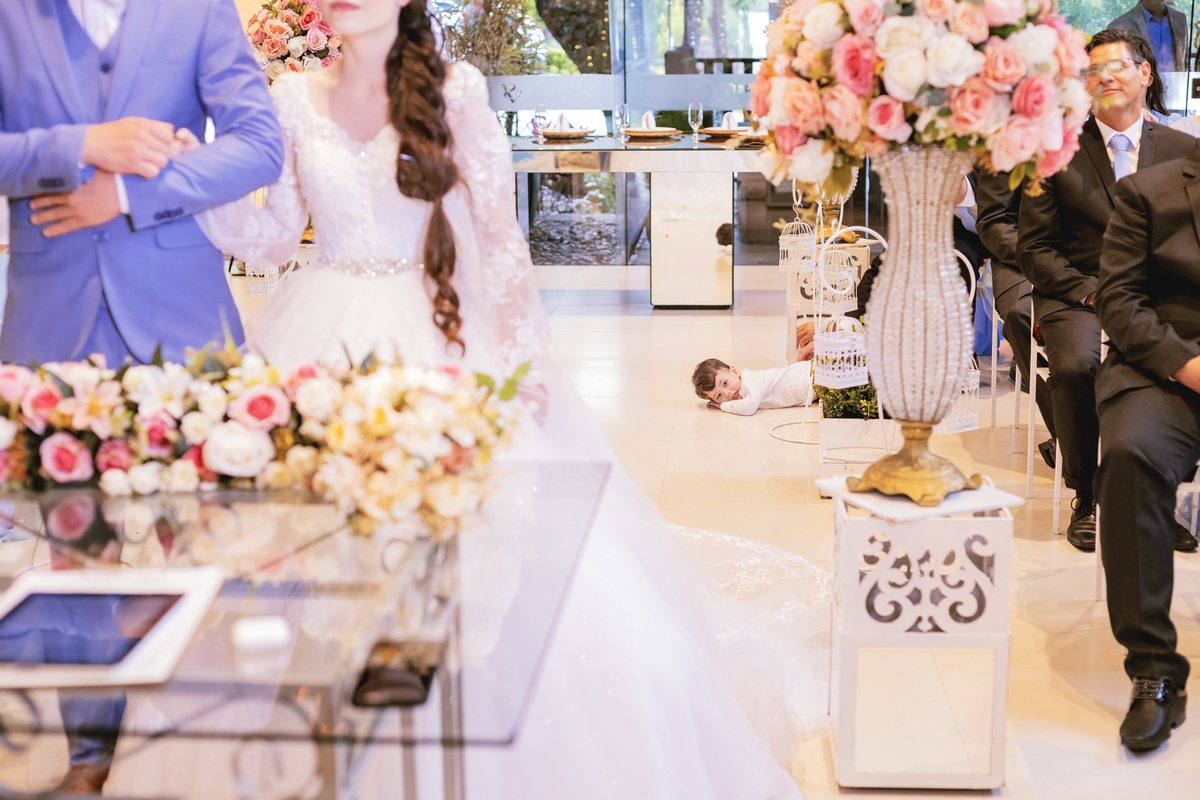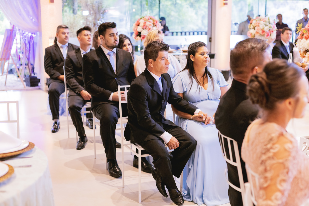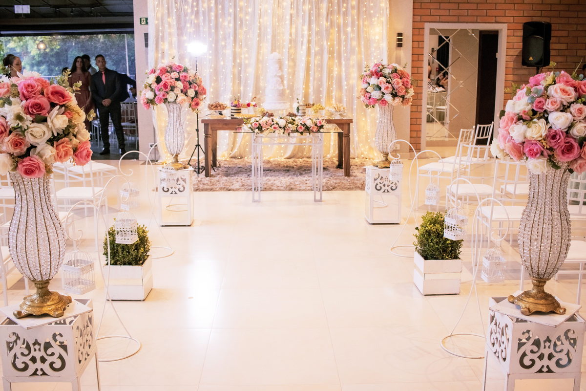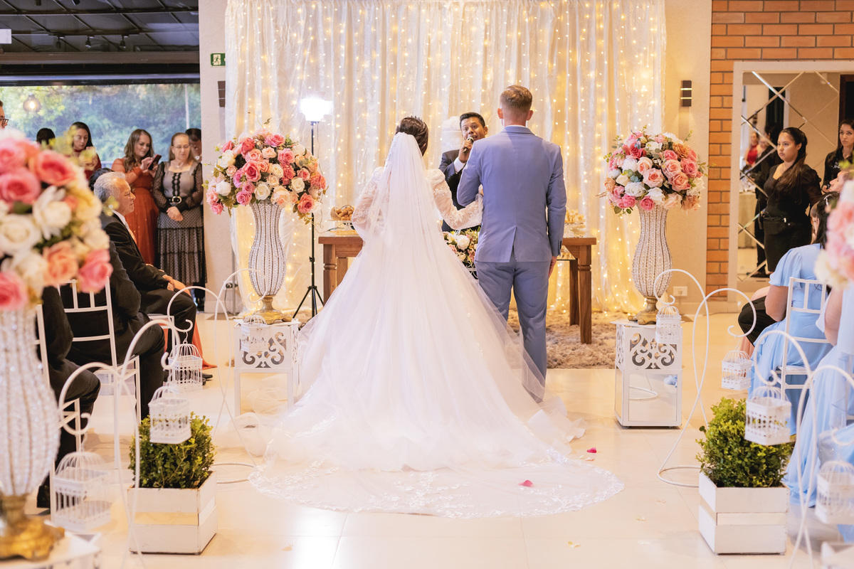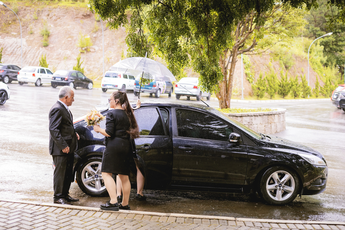 No caminho para o local da cerimônia, começou a chover e a Helô sempre sonhou em se casar ao ar livre. Toda a decoração foi montada no local ao ar livre, porém como não parou mais de chover, em conversa com o noivo juntamente com a equipe de cerimonial, celebrante e fotógrafa foi decidido optar pelo plano B, trazer a decoração para dentro do salão e realizar a cerimônia no interno. Mesmo não saindo tudo 100% como planejado, foi incrível demais. Emocionante a beça!