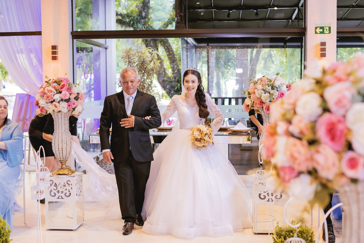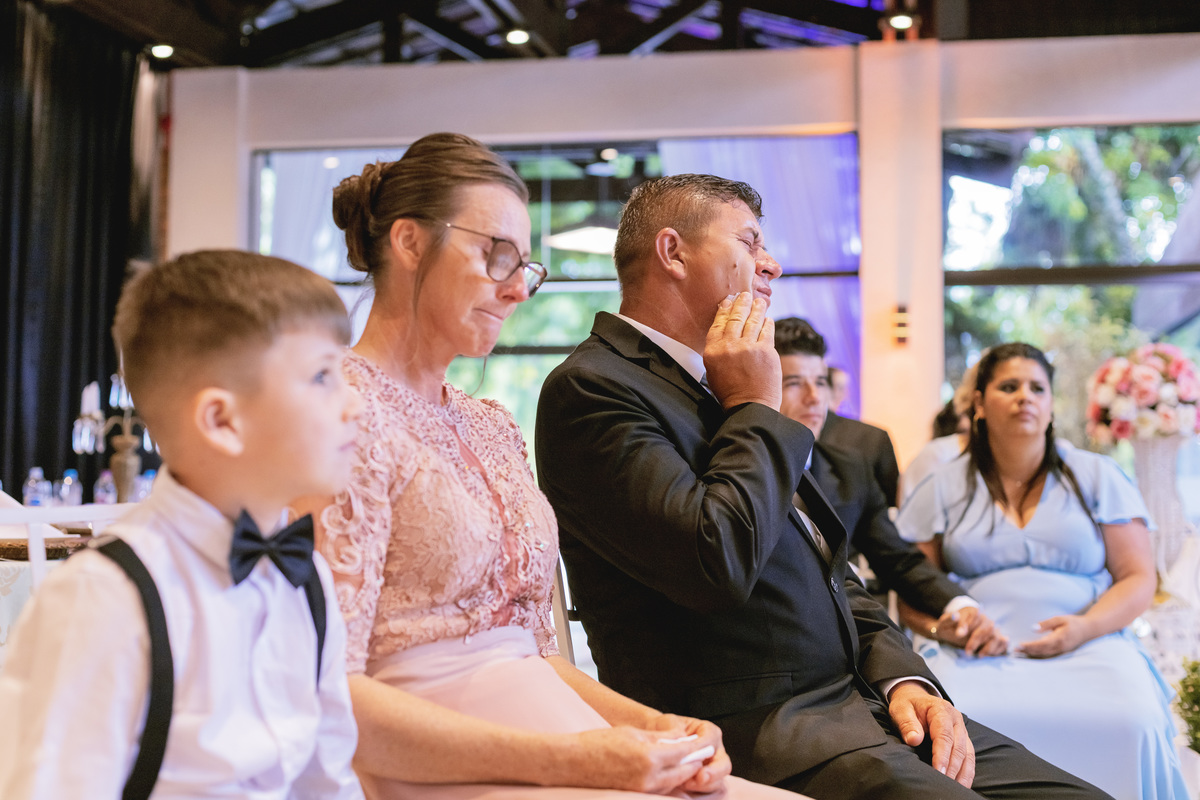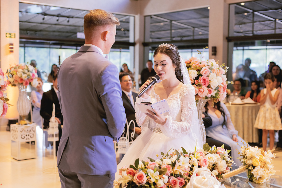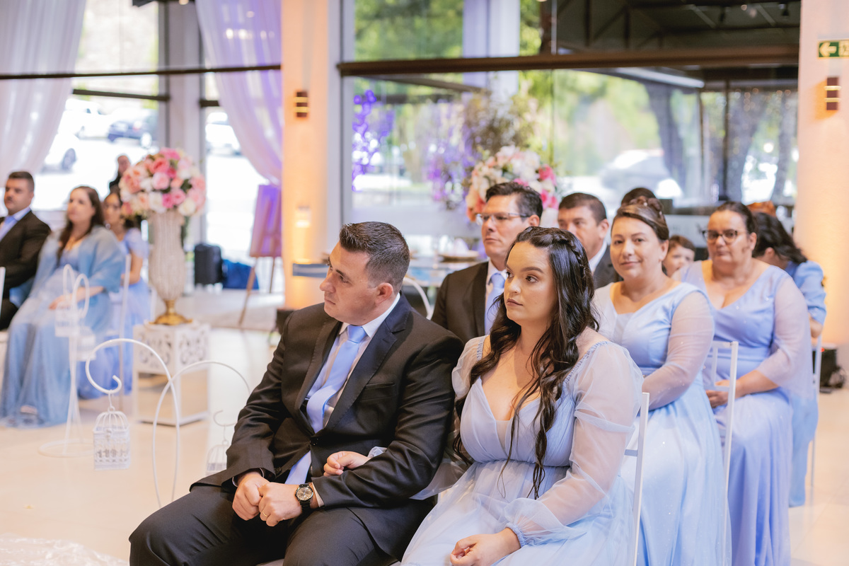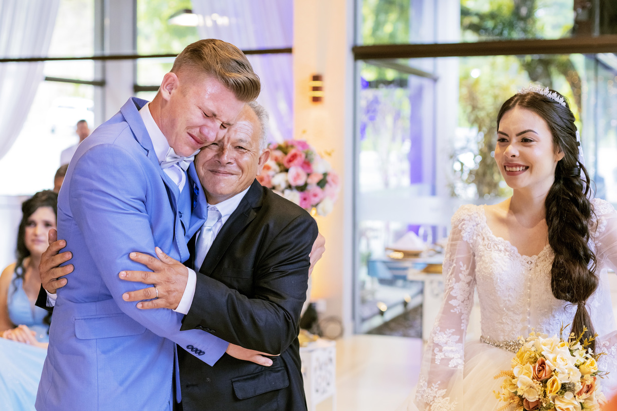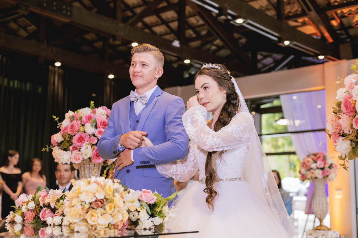 No caminho para o local da cerimônia, começou a chover e a Helô sempre sonhou em se casar ao ar livre. Toda a decoração foi montada no local ao ar livre, porém como não parou mais de chover, em conversa com o noivo juntamente com a equipe de cerimonial, celebrante e fotógrafa foi decidido optar pelo plano B, trazer a decoração para dentro do salão e realizar a cerimônia no interno. Mesmo não saindo tudo 100% como planejado, foi incrível demais. Emocionante a beça!