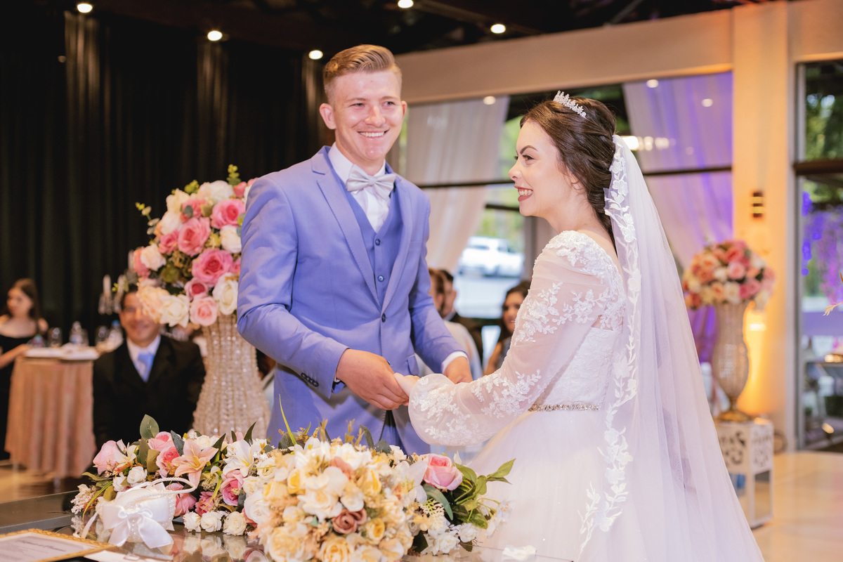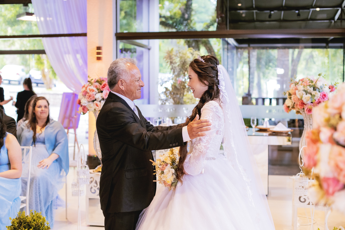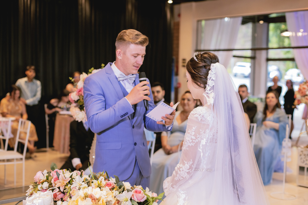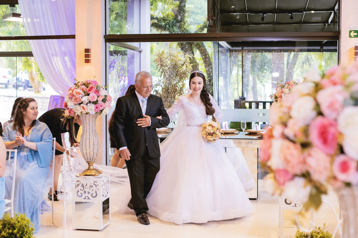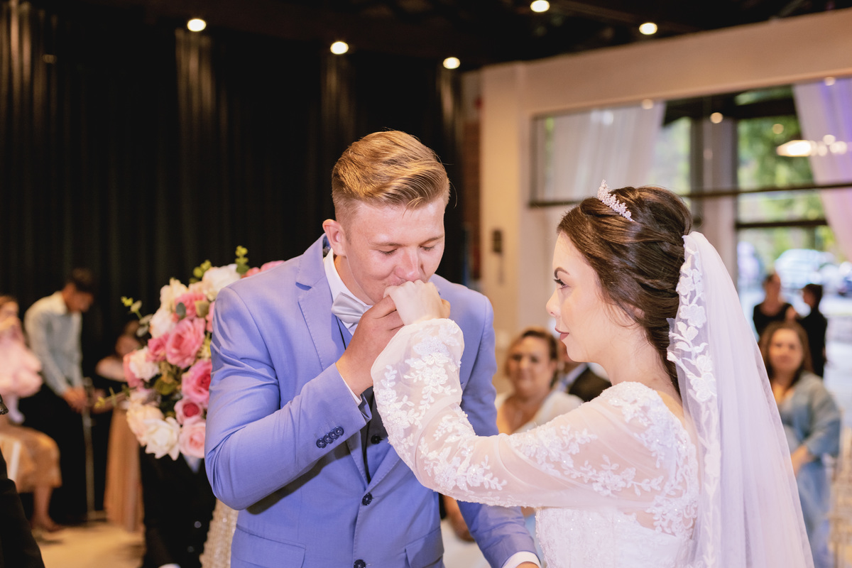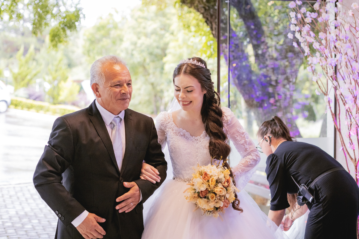 No caminho para o local da cerimônia, começou a chover e a Helô sempre sonhou em se casar ao ar livre. Toda a decoração foi montada no local ao ar livre, porém como não parou mais de chover, em conversa com o noivo juntamente com a equipe de cerimonial, celebrante e fotógrafa foi decidido optar pelo plano B, trazer a decoração para dentro do salão e realizar a cerimônia no interno. Mesmo não saindo tudo 100% como planejado, foi incrível demais. Emocionante a beça!